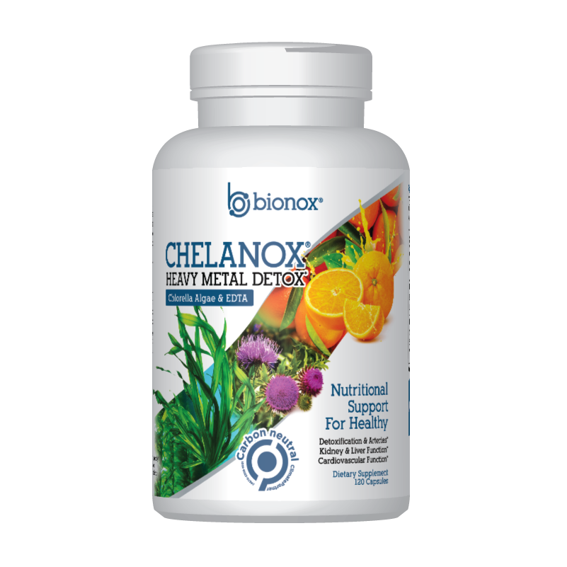 Chelanox binds to and supports the removal of harmful heavy metals like mercury, arsenic, aluminum, cadmium, and toxins from food, water, medicines, and industrial sources using chelating agents such as modified citrus pectin, chlorella, and zeolites.*
