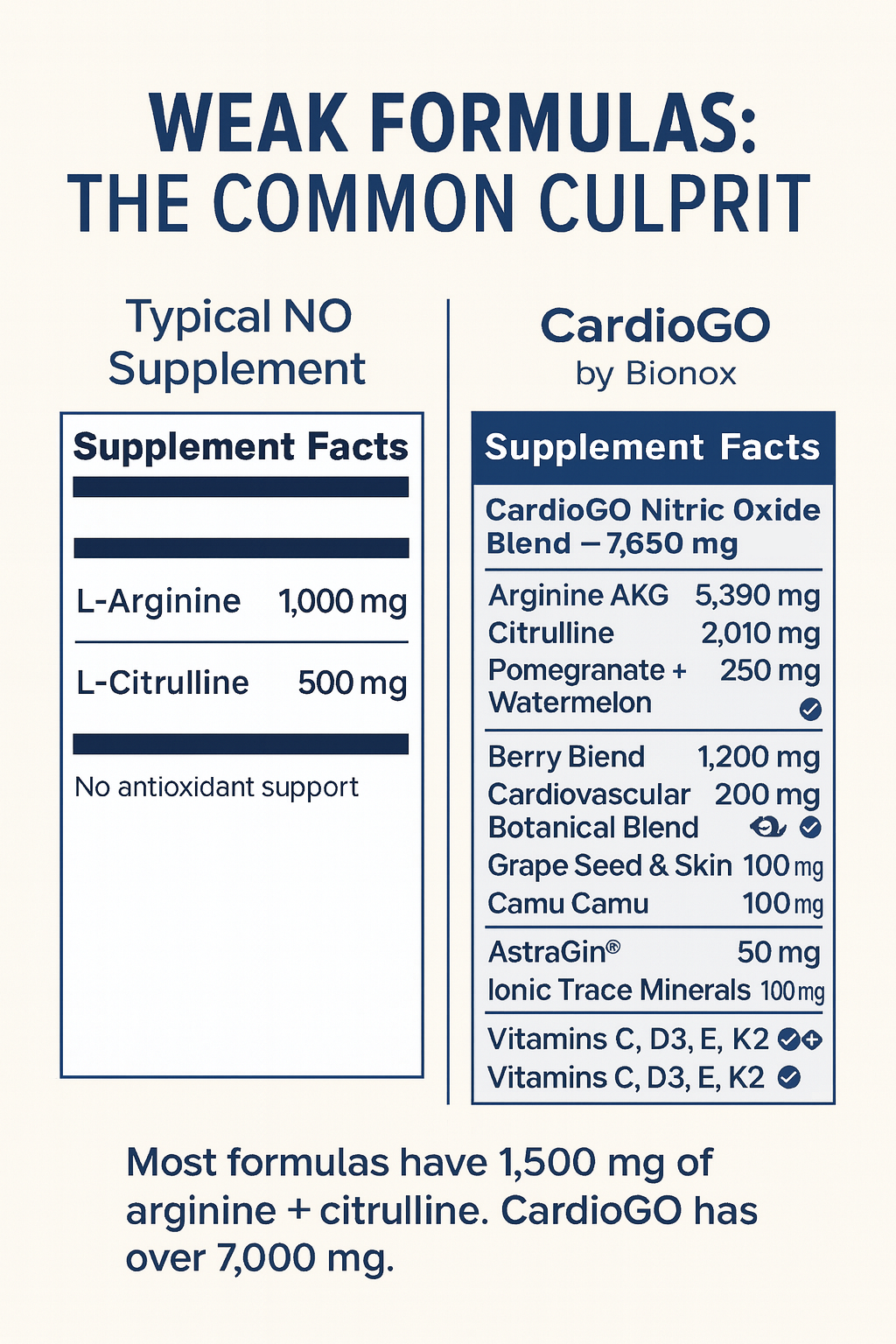 By contrast, CardioGO delivers over 7,600 mg of nitric oxide–boosting amino acids, including advanced forms like Arginine AKG and Citrulline. When paired with antioxidants and synergistic botanicals, this dosage provides the sustained nitric oxide support your body needs to feel real results.