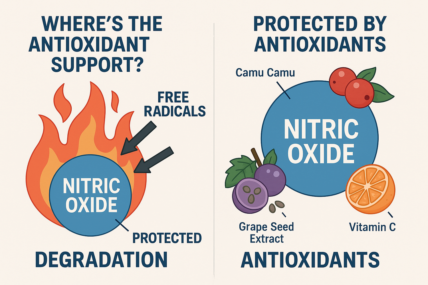 If a product promises “instant results,” that’s a red flag. Short-lived nitric oxide spikes fade quickly—leaving you back at square one. The key is sustained production supported by antioxidants, which protect and extend nitric oxide activity in your body.