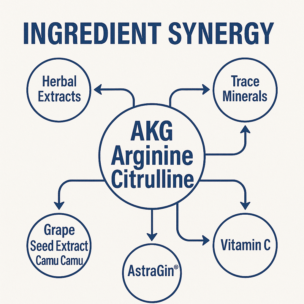 - Arginine AKG + Citrulline for nitric oxide production