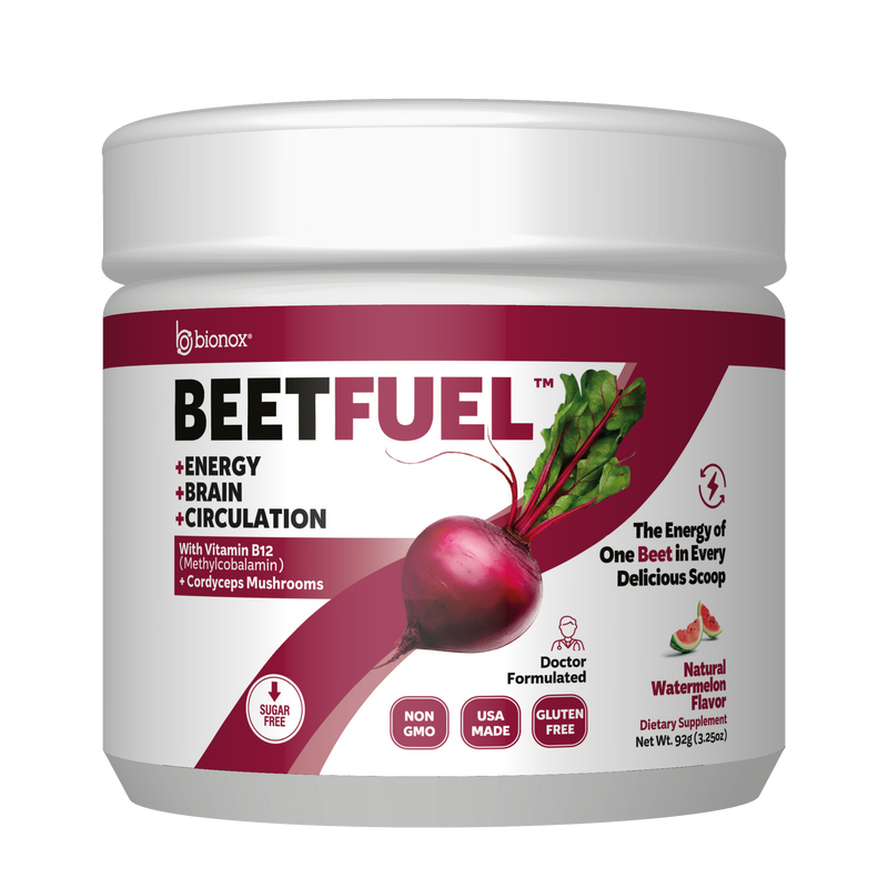 BeetFuel™ supports energy, circulation, endurance, stamina, athletic performance and brain function. Thoughtfully formulated with beet extract, organic beet powder, vitamins B6 and B12, and cordyceps mushrooms, BeetFuel™ delivers a standardized dose of high-quality beetroot nitrates to ensure consistent potency and reliable results—setting BeetFuel™ apart from ordinary beet powders.*